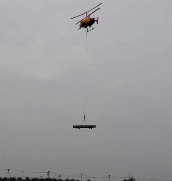 消防及被困人员吊运:配置光电吊舱、探照灯、普通喊话器、伤员运输担架及吊挂装置等任务设施,针对交通不便且急需救援的场景,可对体重满足要求(体重≤80kg)的消防人员或被困人员实施无人直升机快速吊运,实现被困人员快速转运和施救。