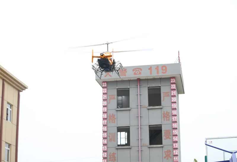 城市工业园区消防灭火:配置光电吊舱、气体分析模块、烟雾探测模块、高亮探照灯、高音喊话器,执行园区火场探测及空中救援指挥与作业区辅助照明灯工作;也可配置光电吊舱、烟雾探测模块、救援物资及灭火弹垂直空投装置(配置5kg灭火弹10枚左右),执行园区火场核心区或危险区的快速灭火,也可执行园区火场救援通道的快速构建工作;也可配置光电吊舱、烟雾探测模块、5镜头倾斜摄影模块、高精度成像SAR雷达等,执行园区火场环境三维成像及爆炸后环境快速三维重建探测工作。森林初期火灾扑灭:配置光电吊舱、探照灯、救援物资及灭火弹垂直空投装置(装载5kg自动感知垂直灭火弹及地面触发灭火弹共计16枚),执行森林初期多个起火点的快速扑灭工作。